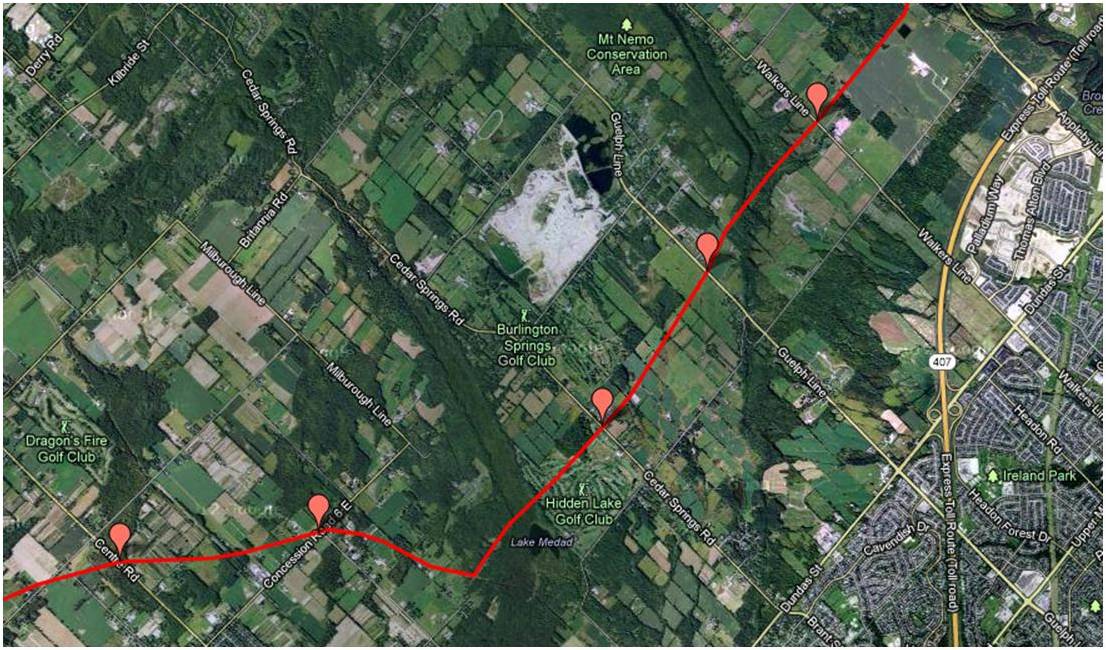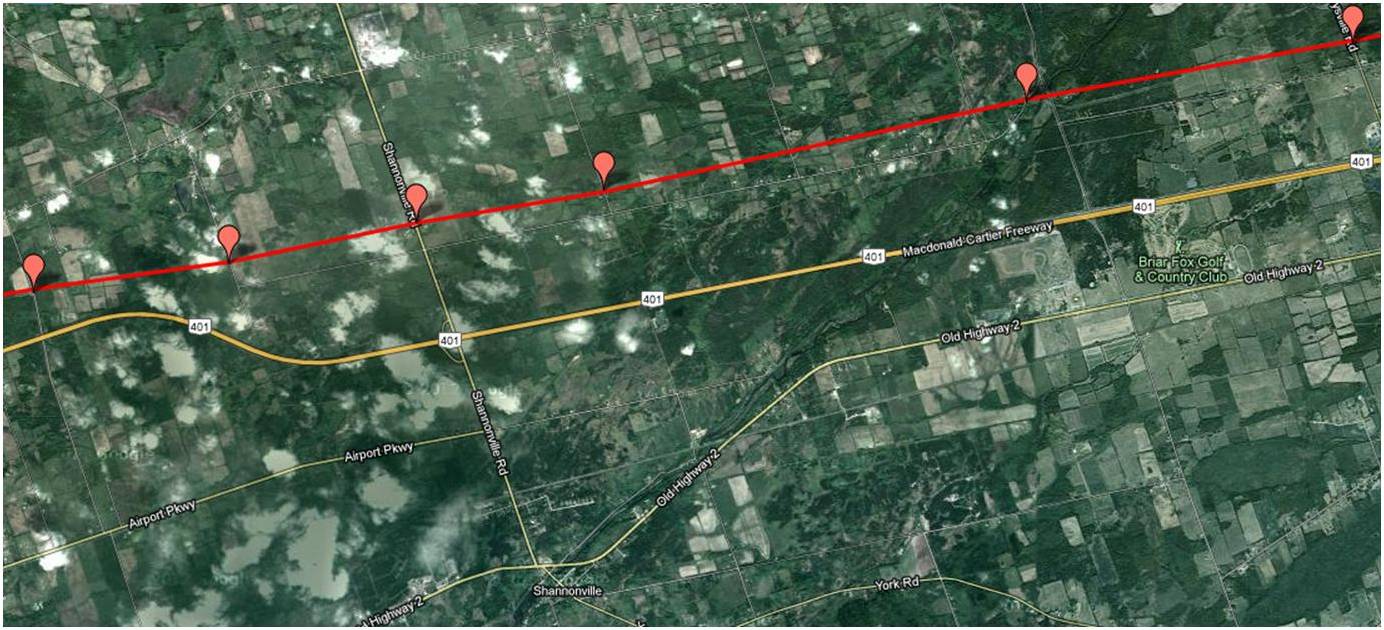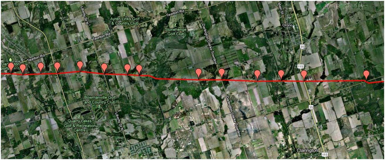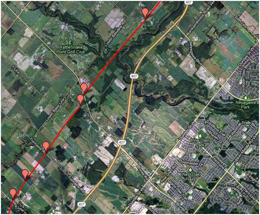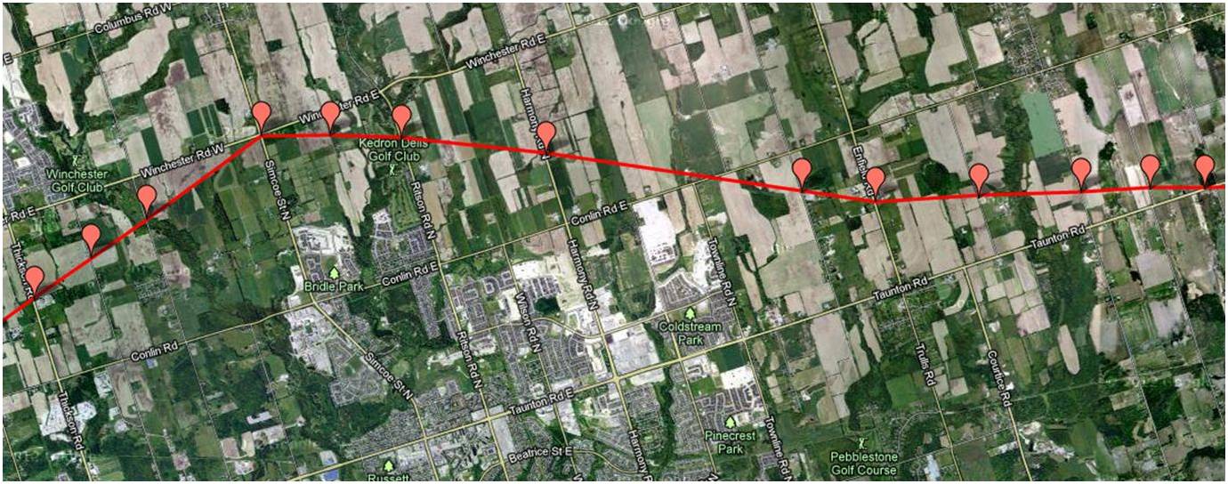 These maps were independently created and have not been verified by Enbridge. The margin of error over the entire pipeline is less than 1 km when compared to Enbridge maps submitted to the NEB. Red placemarks are pipeline verification points (road crossings). Maps are posted in a West to East direction.