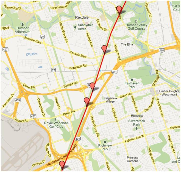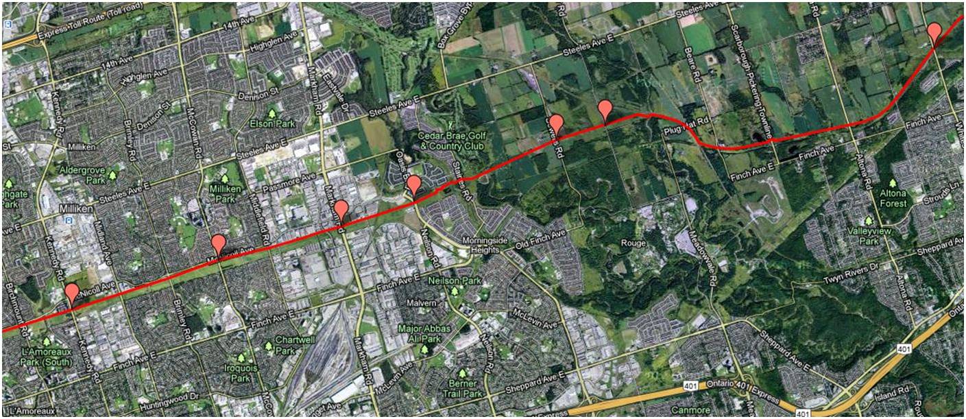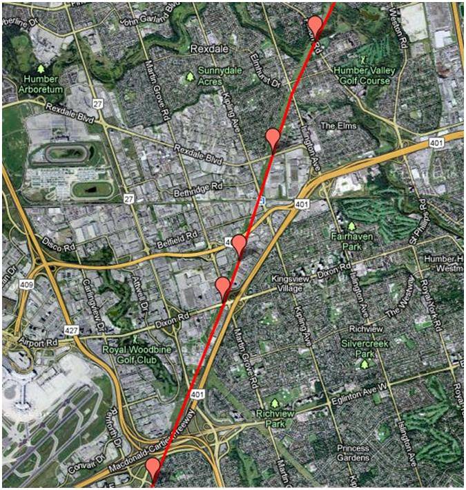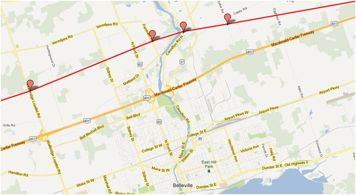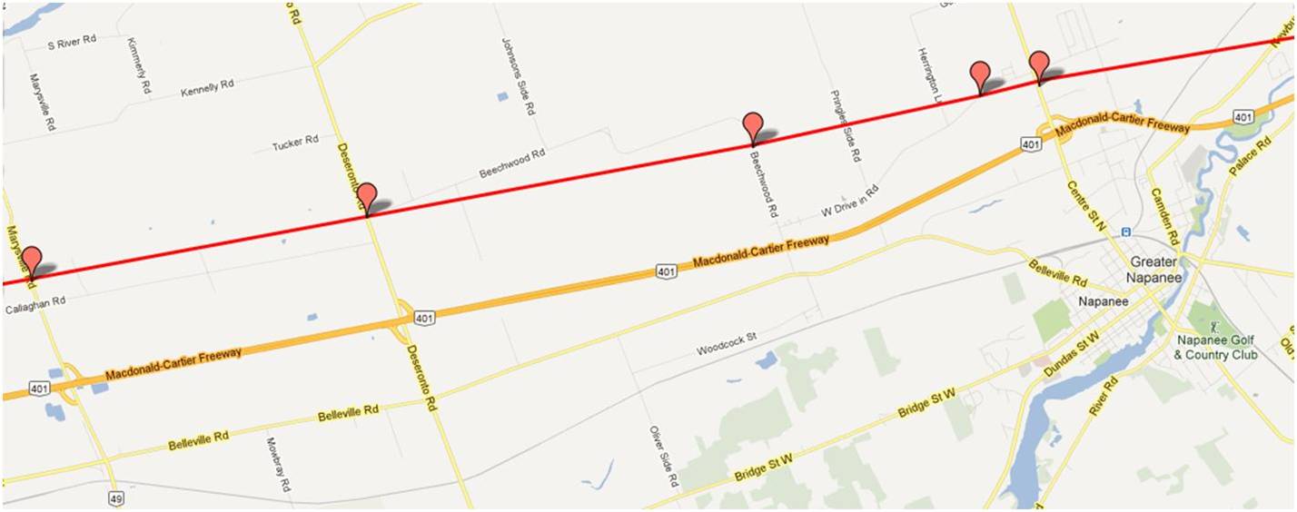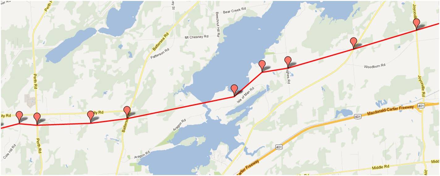 These maps were independently created and have not been verified by Enbridge. The margin of error over the entire pipeline is less than 1 km when compared to Enbridge maps submitted to the NEB. Red placemarks are pipeline verification points (road crossings). Maps are posted in a West to East direction.