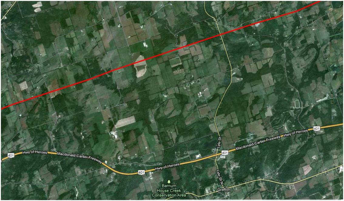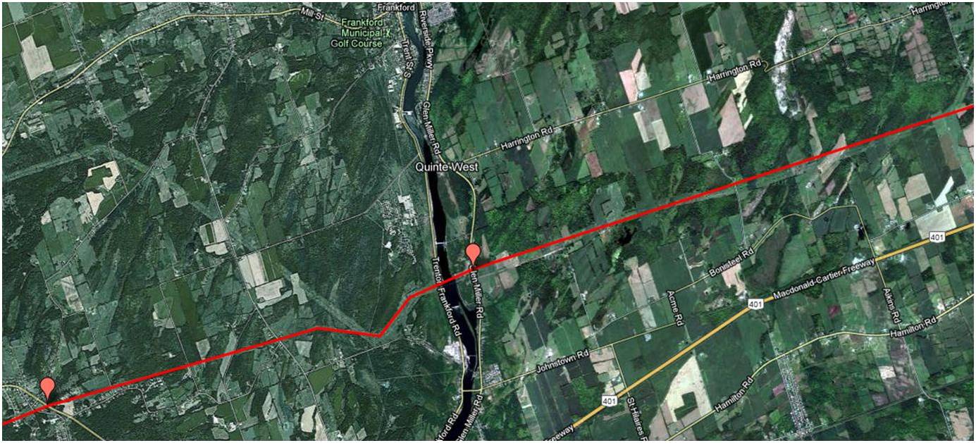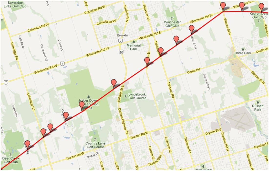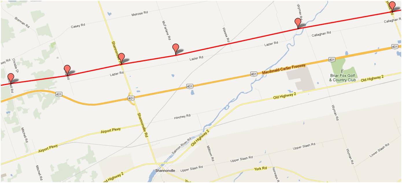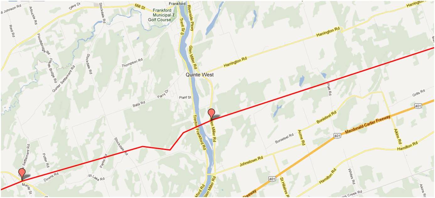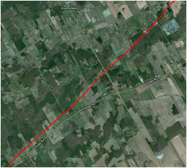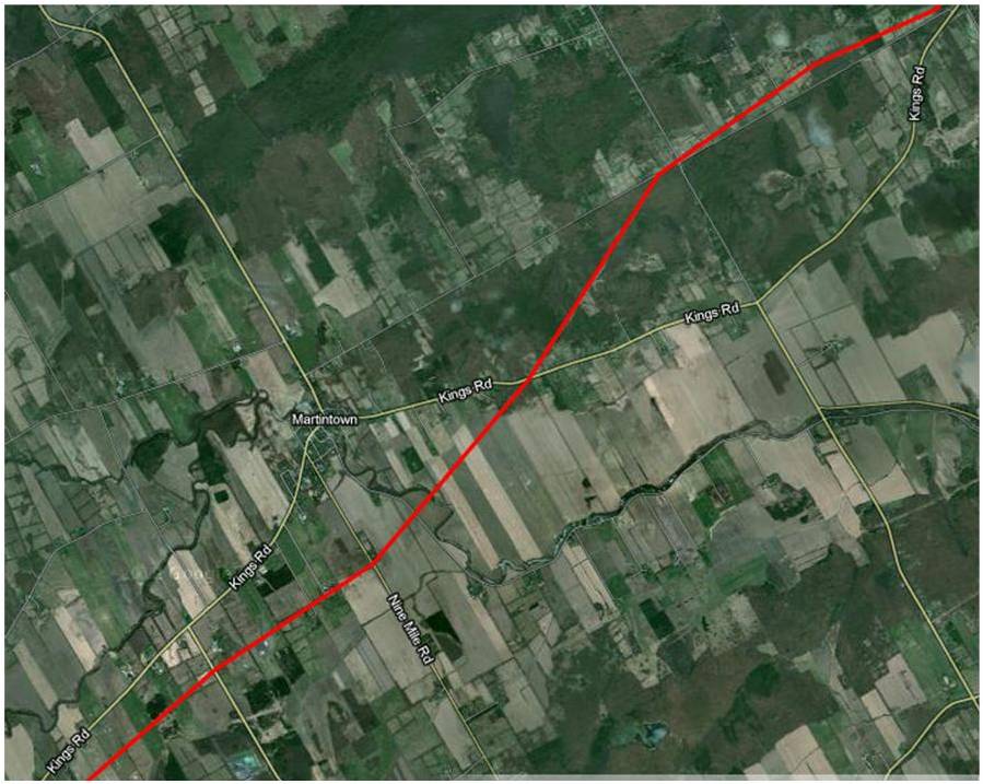 Would it be possible to see a map from Bryanston to where the line crosses the Thames River north east of London Ont.