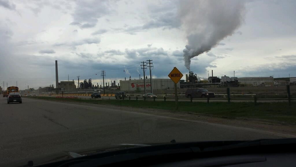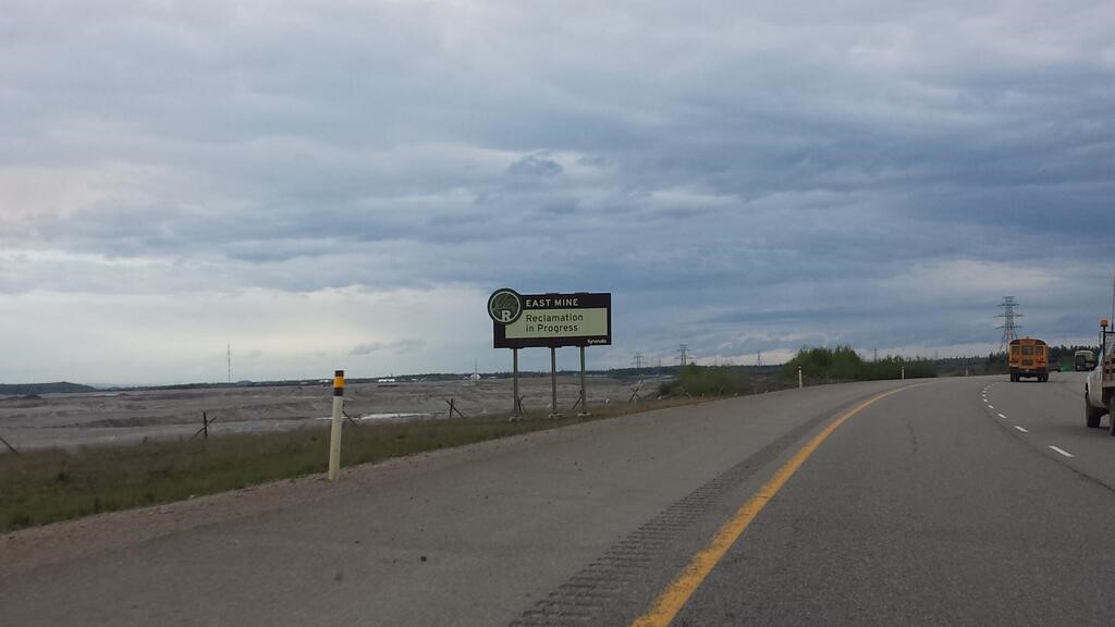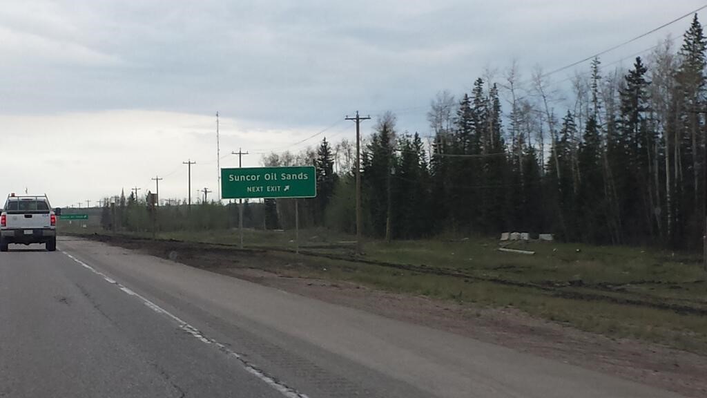 North of Fort McMurray, highway exits are marked by mine names. Next stop, Suncor.